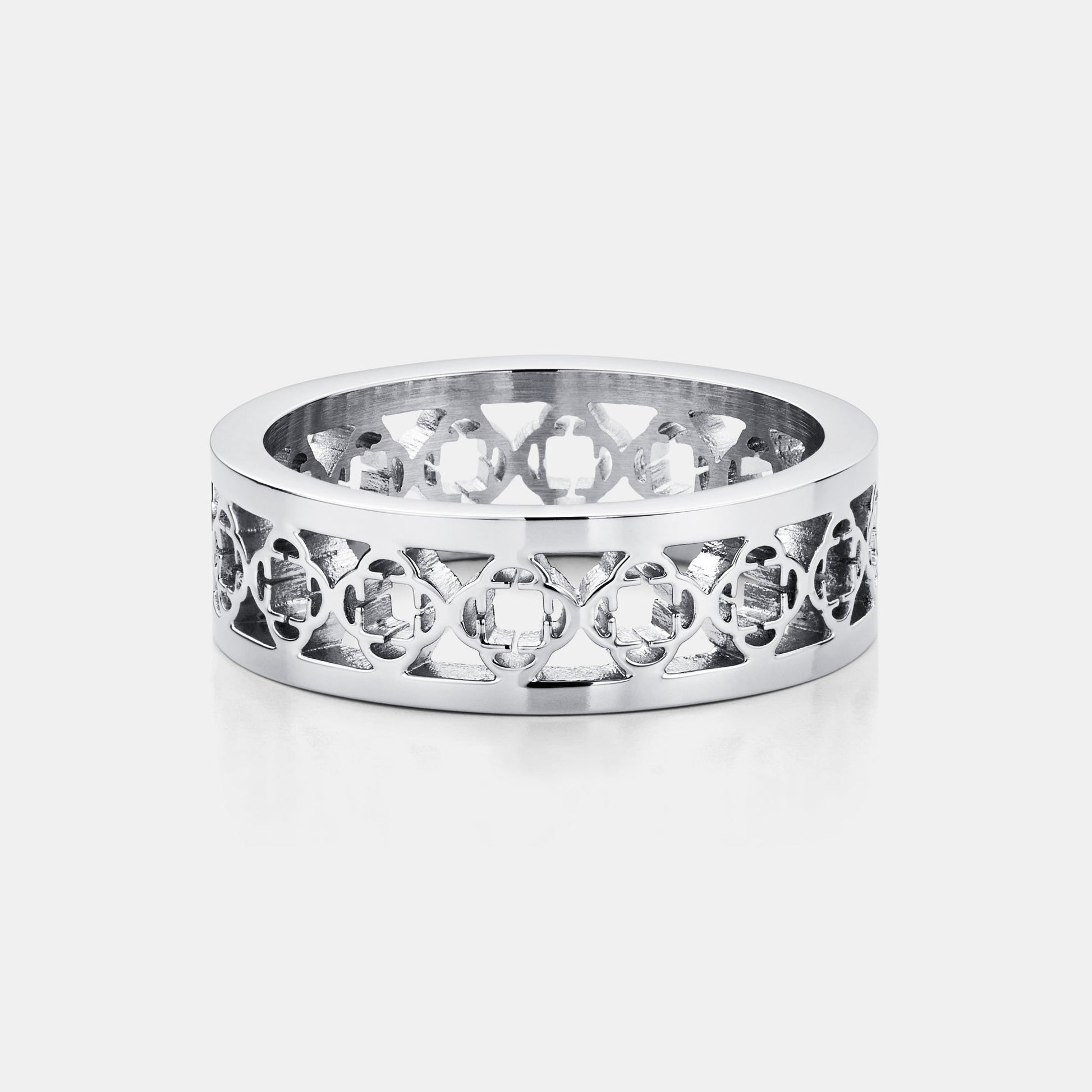Con una larghezza di 8 mm, questo Anello a Fascia in Argento vanta un intricato motivo a graticcio, ispirato alla silhouette del nostro logo Clover. La sua placcatura ultra-durevole e resistente ai graffi, insieme a un profilo lucido e levigato, garantiscono non solo una vestibilità comoda, ma anche una finitura di livello superiore. Per coloro che apprezzano i dettagli più fini, indossalo da solo per un look distintivo, oppure combinato con l'Anello Sovereign Clover per un'affermazione personalizzata.