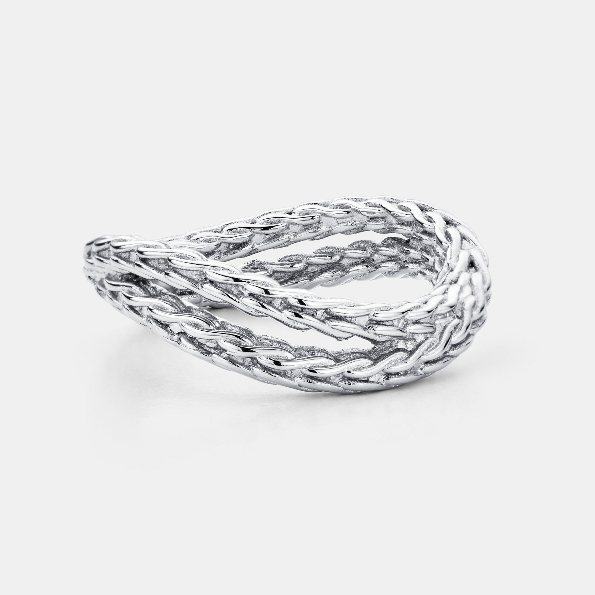 Caratterizzato da due bande di cordino intrecciate che si avvolgono naturalmente attorno al tuo dito, questo anello in argento incarna un'estetica grezza e organica. Il suo design minimalista è arricchito da dettagli e accenti intricati, creando un pezzo davvero unico.Questo pezzo premium è rifinito con una protezione resistente ai graffi e allo sbiadimento, e una garanzia a vita come standard.