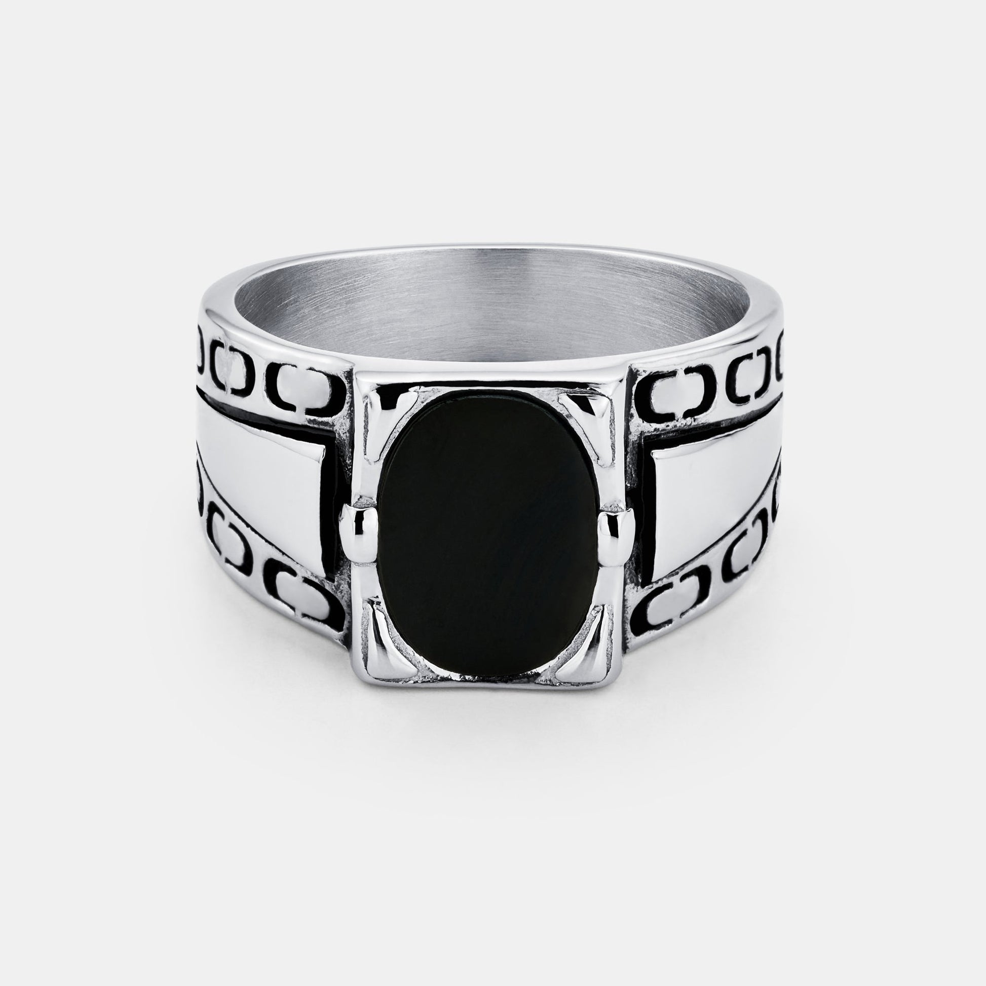 Non lasciare dubbi su chi sei—Una solida pietra ovale nera è incastonata su una fascia angolare, abbellita con l'insegna di qualità Craftd.