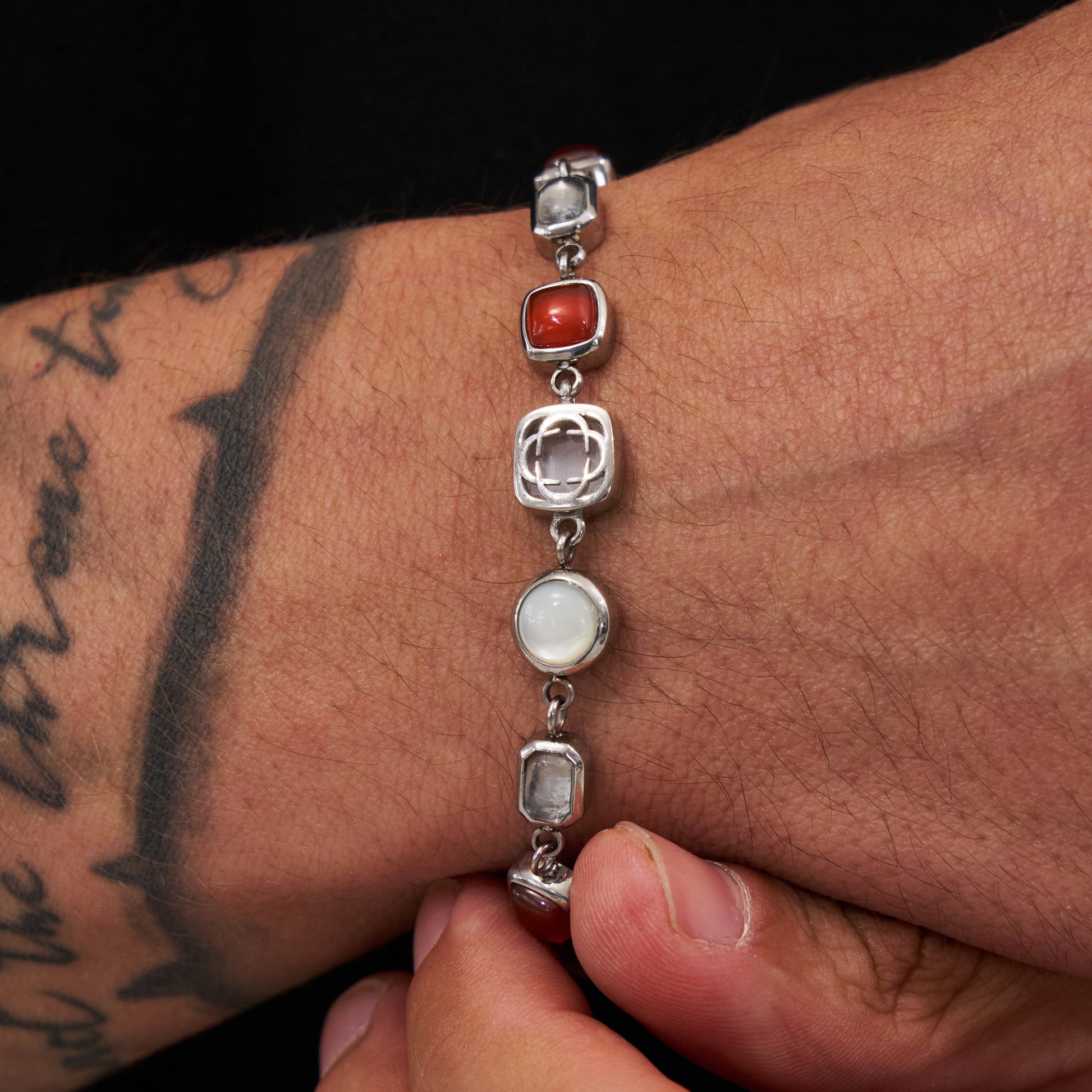 Questo bracciale in gemme presenta un forte contrasto con perle bianche affiancate da ricchi cristalli rossi e trasparenti. Ogni gemma è saldamente alloggiata in una montatura a corona, con bordi smussati che esaltano sia le sue tonalità vivaci che la sua durata. Perle di madreperla ovali più grandi portano equilibrio al design, mentre gli accenti in argento a forma di trifoglio rendono questo un vero pezzo d'affermazione. I link accoppiati garantiscono una vestibilità senza soluzione di continuità sul polso, mentre la nostra chiusura a prova di scatto e il rivestimento resistente ai graffi rendono questo un pezzo veramente CRAFTD per durare nel tempo.