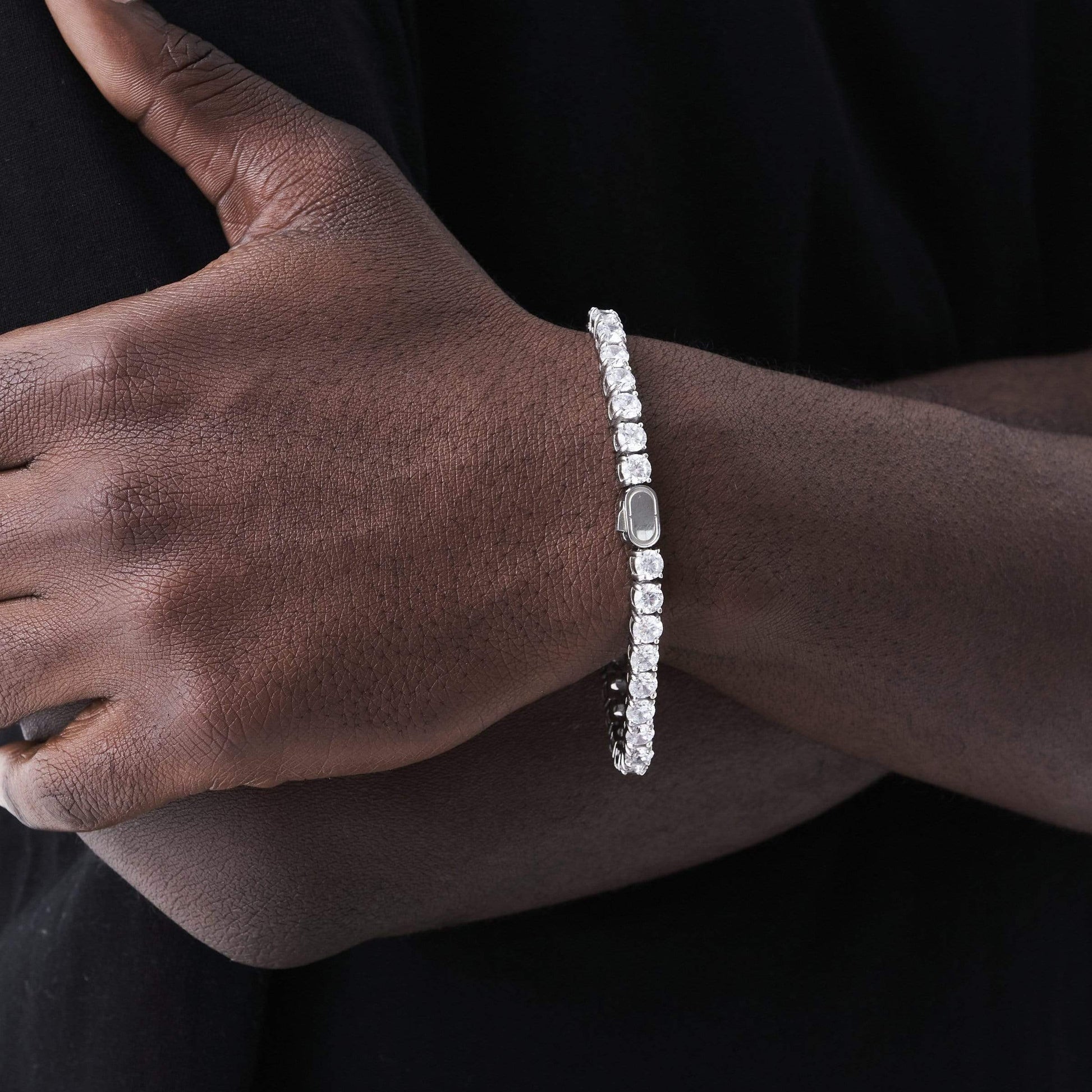 Questo Bracciale Tennis ICED è impreziosito da una fila di pietre taglio brillante da 5mm, ciascuna selezionata a mano e montata con precisione in una montatura in argento a quattro griffe. Questa montatura non solo protegge le pietre, ma massimizza la riflessione della luce, conferendo a ciascuna di esse una lucentezza che compete anche con i diamanti più pregiati. Il bracciale si adatta comodamente al polso, assicurato con una chiusura a prova di scatto e rifinito con una protezione resistente ai graffi.