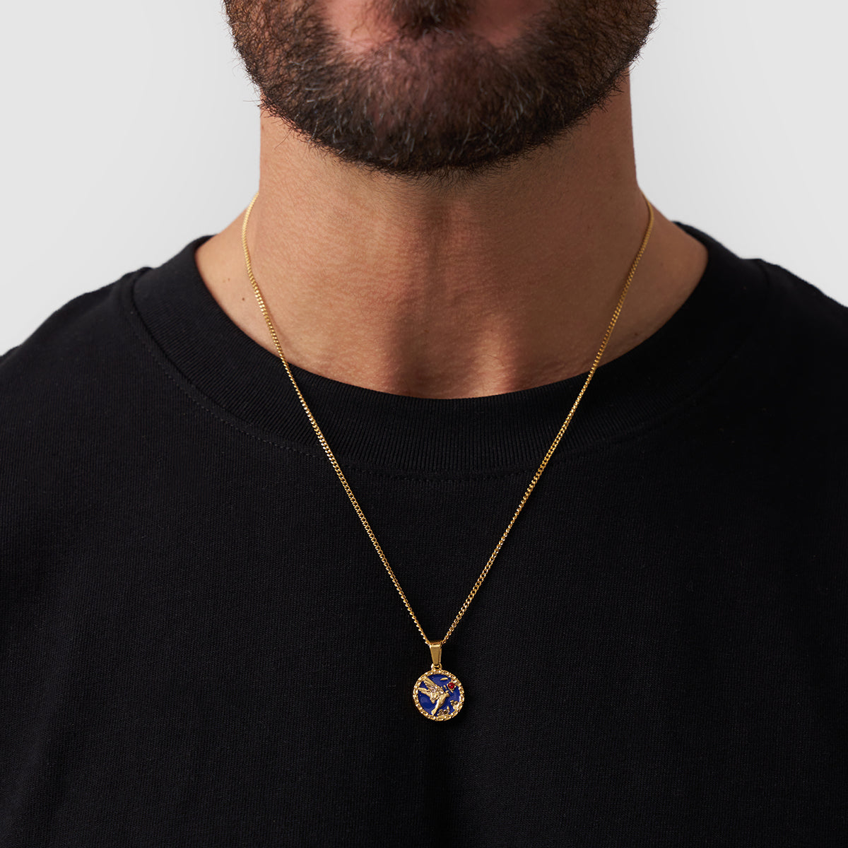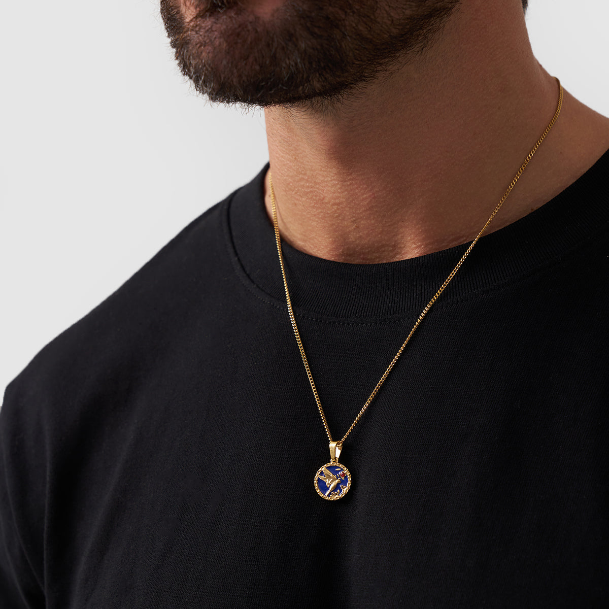 Questo esclusivo ciondolo in oro 18K presenta un'incredibile rondine in volo, impostata su uno sfondo di smalto blu intenso. Circondato da un intricato bordo smussato, il medaglione include una singola rosa rossa, adornata con una pietra preziosa rossa naturale. Pende da un robusto anello d'oro, una classica catena a maglie da 2 mm, ed è rifinito con una protezione resistente ai graffi e allo sbiadimento.