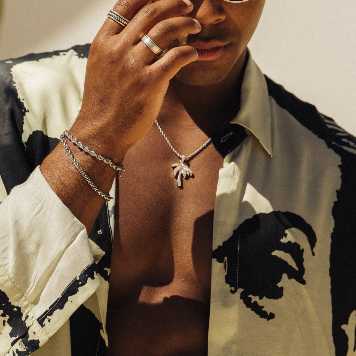Questo collier ICED presenta un ciondolo a forma di palma finemente dettagliato. È caratterizzato da centinaia di pietre AAA di grado freddo, selezionate a mano e impostate con precisione per offrire un lucido che compete anche con i diamanti più pregiati. Indossalo ogni giorno come promemoria per fare un passo indietro, assaporare i raggi e prendere un po' di tempo per resettare. È sospeso da un gancio in argento di alta qualità, catena a corda da 2 mm, e rifinito con una protezione resistente ai graffi e allo sbiadimento.