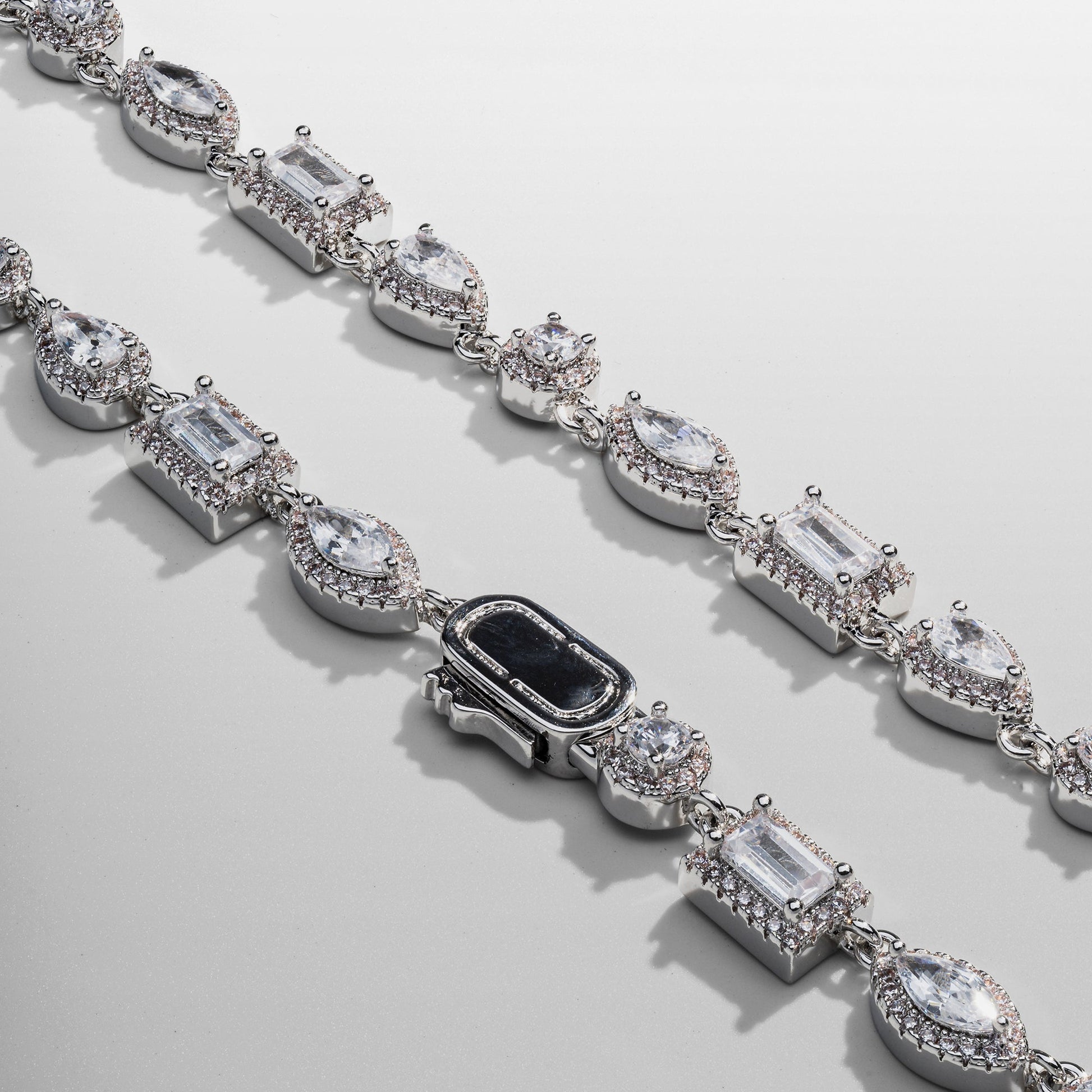 Questa collana presenta cristalli ovali, a goccia e taglio smeraldo alternati, ciascuno incastonato in un'impostazione in argento a 4 artigli. Progettata per riflettere la luce naturale, ogni cristallo è circondato da un alone dei più freddi pietre di grado AAA—selezionate a mano e incastonate con precisione per una lucentezza che compete persino con i diamanti più raffinati. La catena si adagia senza sforzo attorno al collo, fissata con una chiusura a prova di scatto e rifinita con una protezione resistente ai graffi.