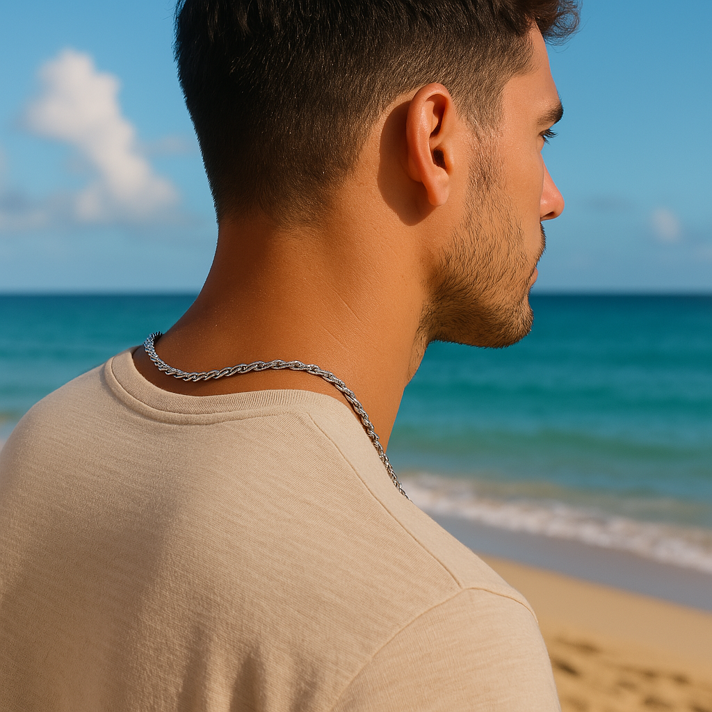 Con un audace design a corda intrecciata e una finitura galvanizzata, questa catena è pensata per uomini d’azione, che sanno cosa vogliono e non aspettano l’approvazione degli altri. Disponibile in argento, unisce eleganza e presenza, rendendola perfetta per ogni occasione, dal casual al formale.