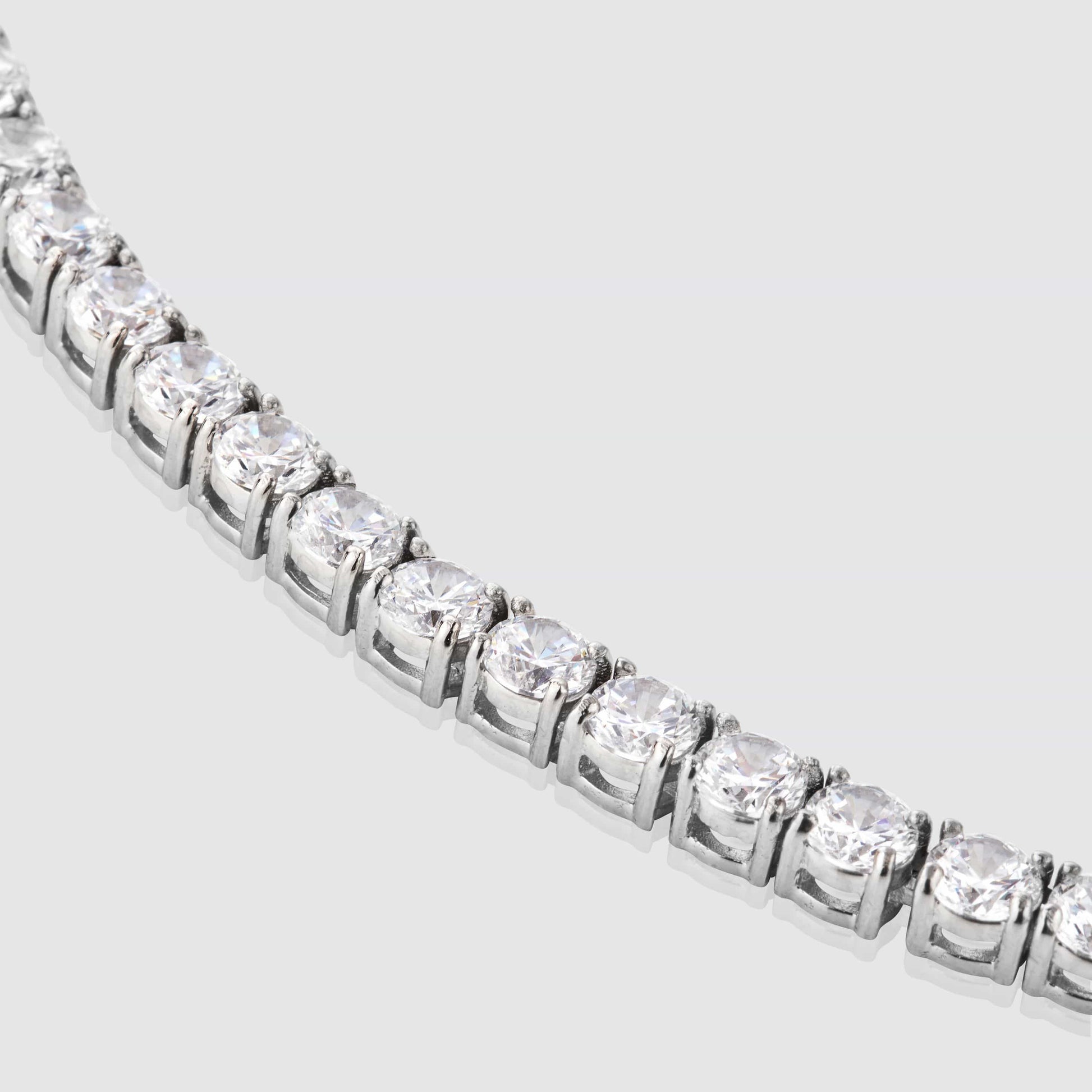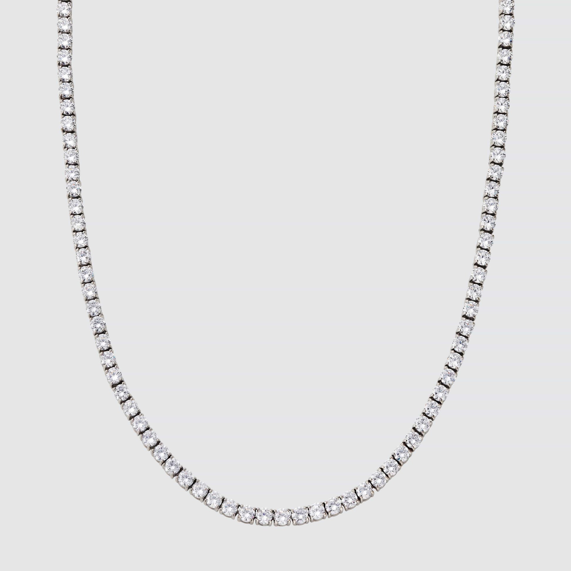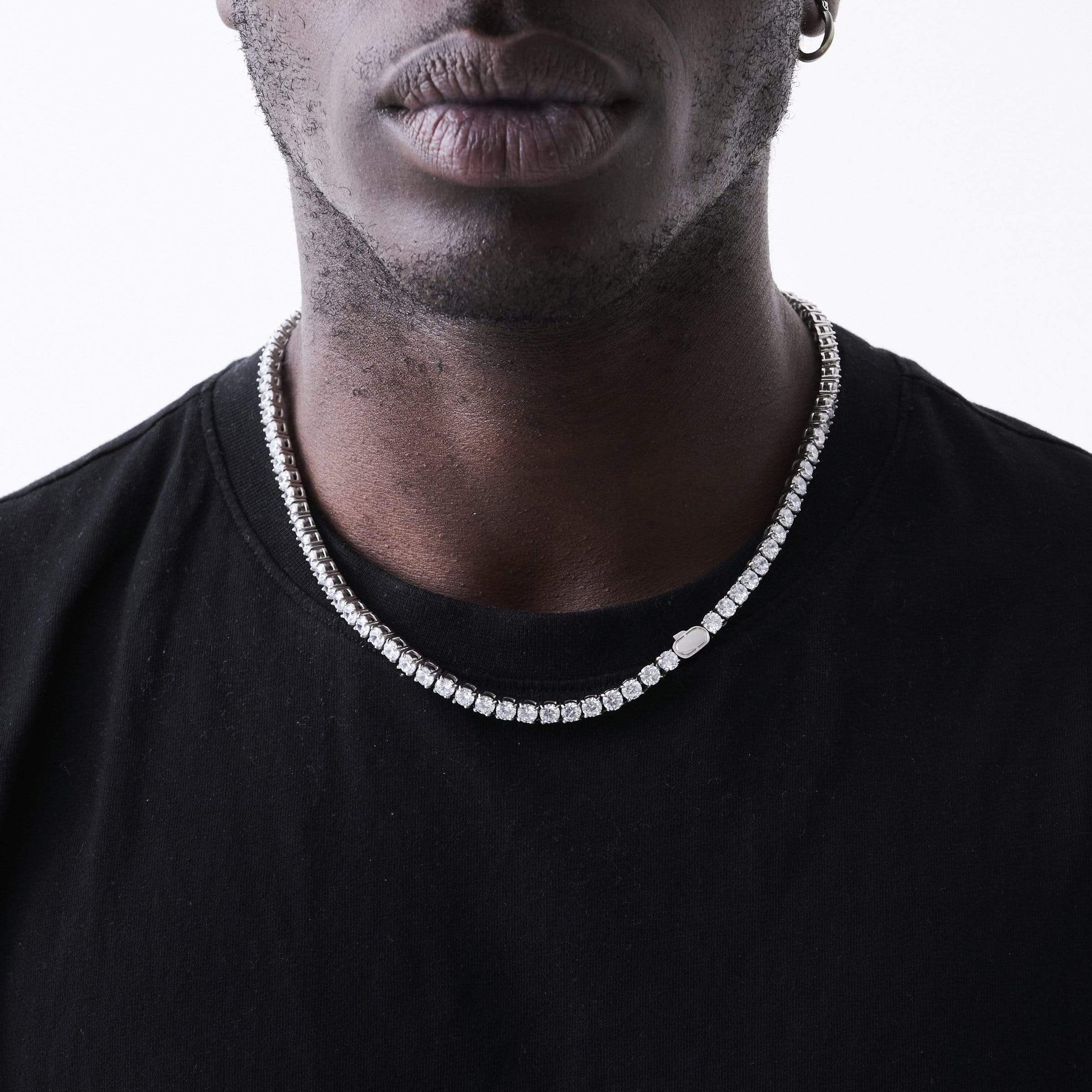 La Collana Tennis ICED presenta una fila di pietre tagliate a brillante di 5mm, ciascuna selezionata a mano e montata con precisione in un'impostazione argentata a quattro griffe. Questa impostazione non solo protegge le pietre, ma massimizza la riflessione della luce, dando a ciascuna di esse una lucentezza che rivaleggia con i diamanti più pregiati. La collana si adagia senza sforzo attorno al collo, fissata con una chiusura a prova di scatto e rifinita con protezione resistente ai graffi.