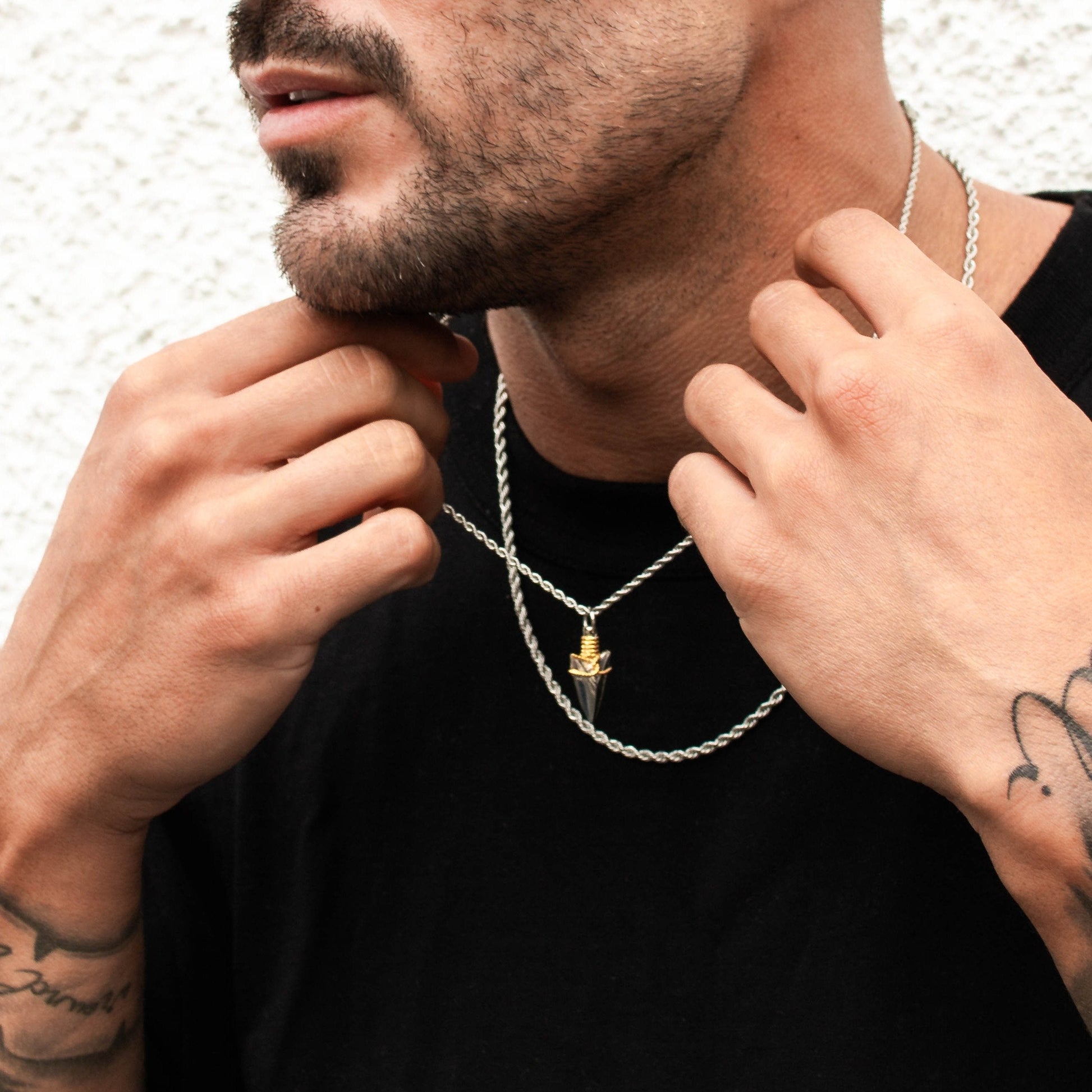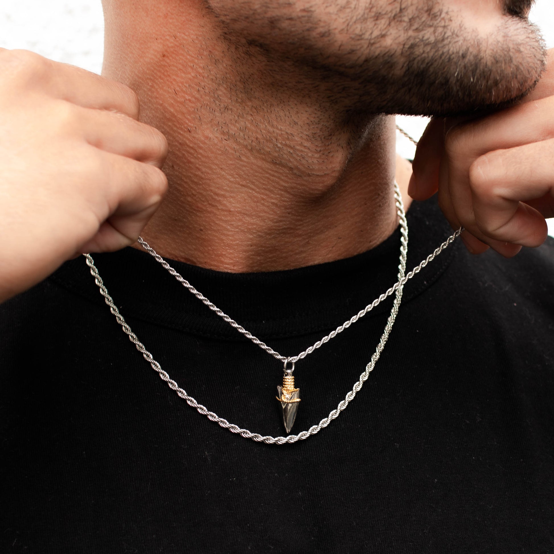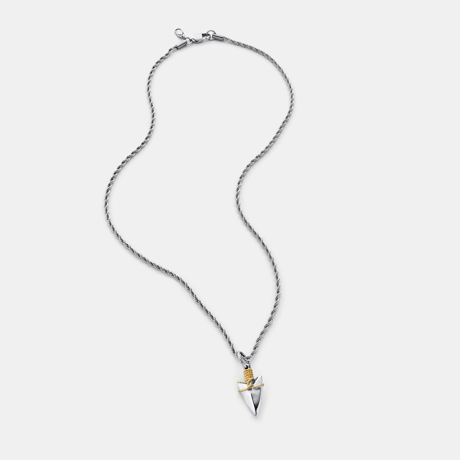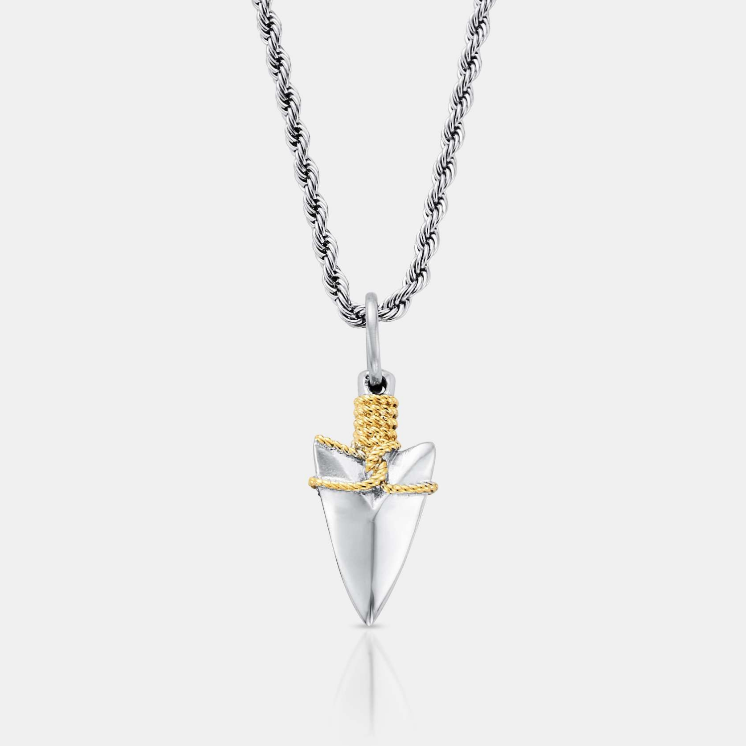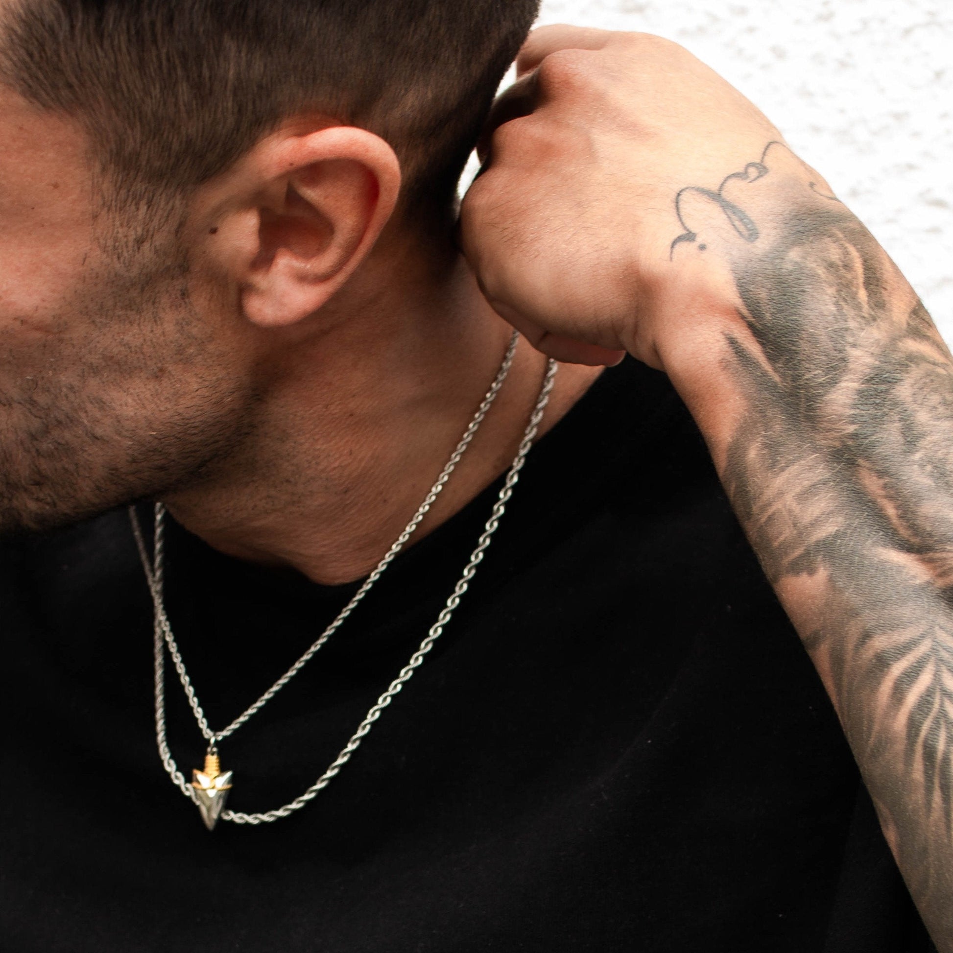 Questo collier presenta un pendente a forma di freccia perfettamente realizzato a mano, progettato con un audace mix di argento e oro. Proprio come una freccia in volo, rappresenta progresso, slancio e la spinta inarrestabile a andare avanti, indipendentemente dagli ostacoli. È sospeso da un gancio in argento di alta qualità, catena a corda da 3 mm, e finito con una protezione resistente ai graffi e allo sbiadimento.
