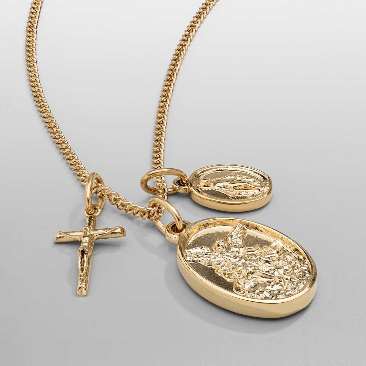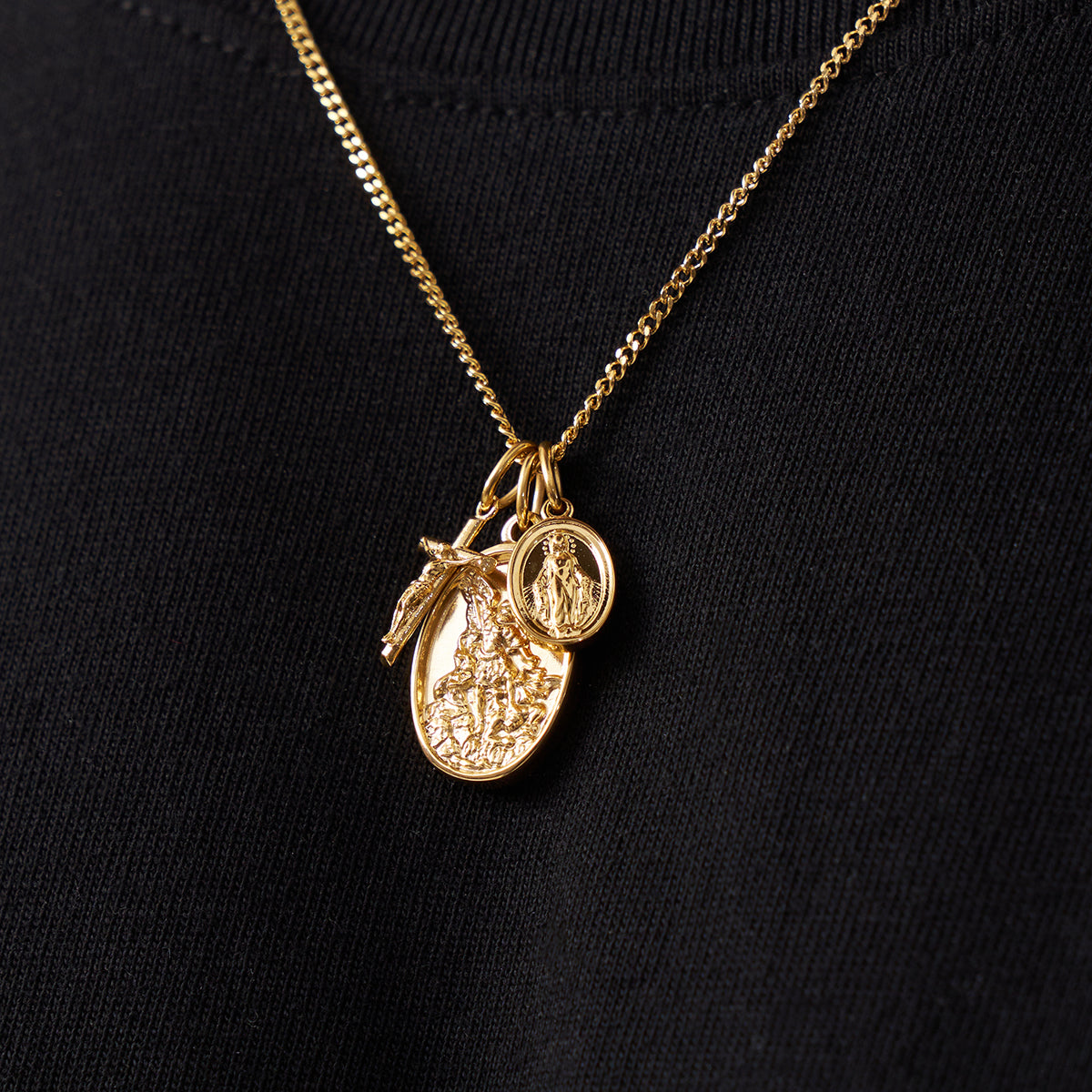Questa collana in oro 18K unisce due potenti simboli. Un crocifisso finemente dettagliato pende accanto a due medaglioni incisi a mano della Vergine Maria. Insieme, rappresentano le benedizioni che Maria offre a coloro che le cercano e la forza che Gesù fornisce nei momenti di bisogno. Ogni pendente è sospeso da un robusto anello d'oro, una classica catena a maglie da 2 mm, ed è protetto con una finitura resistente ai graffi e allo sbiadimento.
