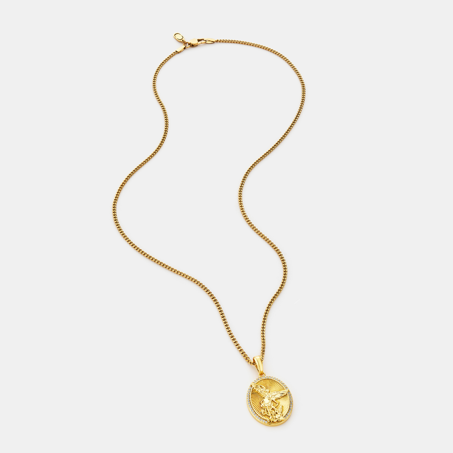Questo pendente ICED presenta una rappresentazione dettagliata dell'arcangelo San Michele, tuo campione di giustizia e guardiano nei momenti di avversità. Mostra le pietre AAA di qualità più fredda, selezionate a mano e montate con precisione per offrire una brillantezza che compete persino con i diamanti più raffinati. È sospeso da un gancio in oro 18 carati, catena connell da 2 mm, e rifinito con una protezione resistente ai graffi.
