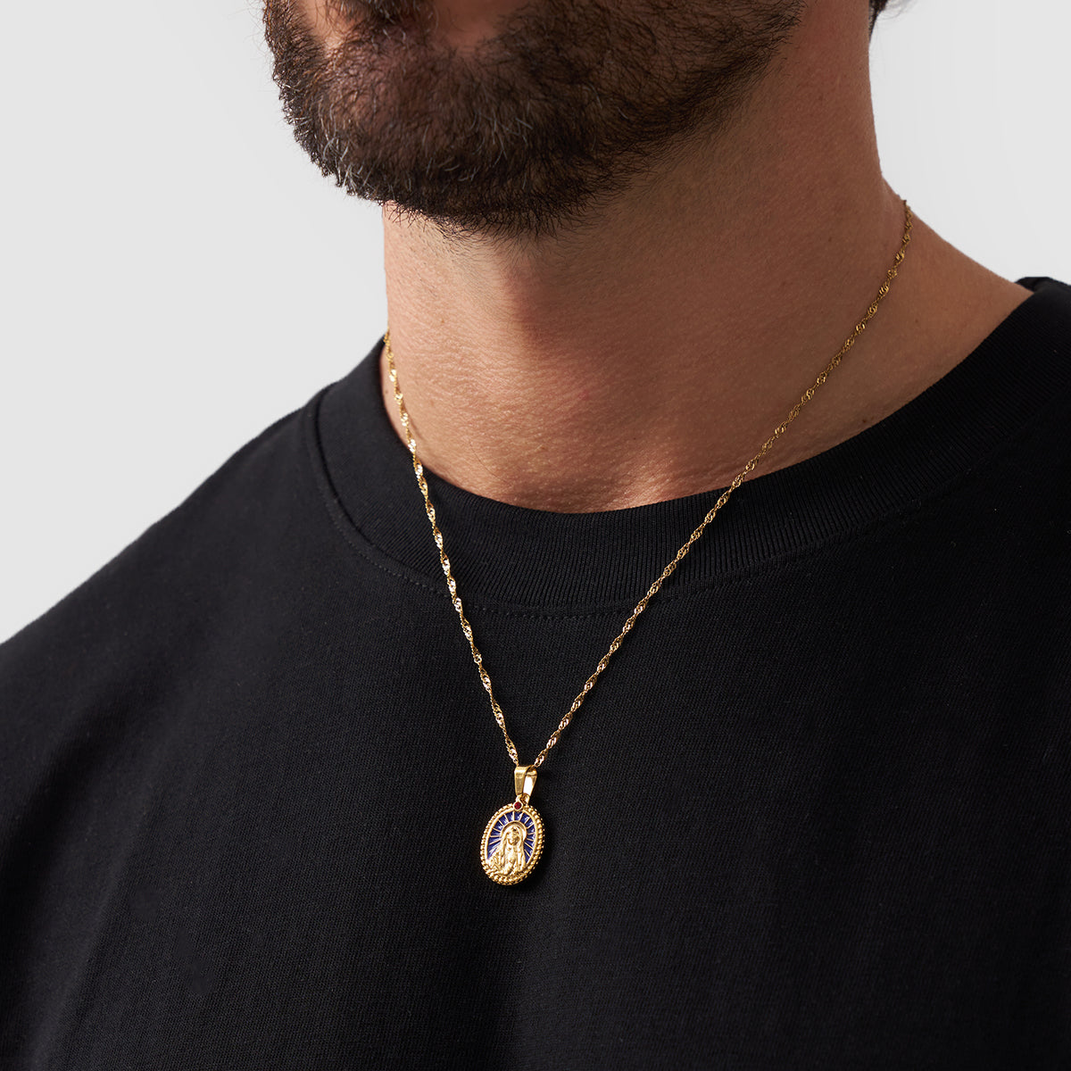 Questo pendente in oro 18K presenta una rappresentazione dettagliata della Madonna, su uno sfondo di smalto blu intenso. Realizzato a mano con una tecnica di cloisonné senza tempo, raggi di luce circondano le sue mani in preghiera, simboleggiando le benedizioni che lei conferisce a chi lo indossa. Il design è incorniciato da delicati lavori di perline ed è coronato da un singolo gemma rossa. Pende da un robusto anello d'oro, una classica catena a corda di 2mm, ed è rifinito con una protezione resistente ai graffi e allo sbiadimento.